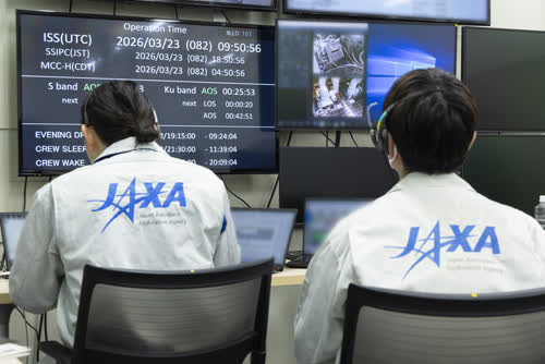 クリストファー・ウィリアムズ宇宙飛行士による、微小重力環境に起因する精密機器の誤差発生に関する影響解析(TUSK PM)のデモンストレーション(デモ#5)を見守る関係者 / 微小重力環境に起因する精密機器の誤差発生に関する影響解析(Test facility for lab-aUtomation System in Kibo Precision measurement Mission: TUSK PM) / 筑波宇宙センター(TKSC) 宇宙実験用棟 ユーザ運用エリア(UOA) / 撮影日:2026年3月23日(日本時間)