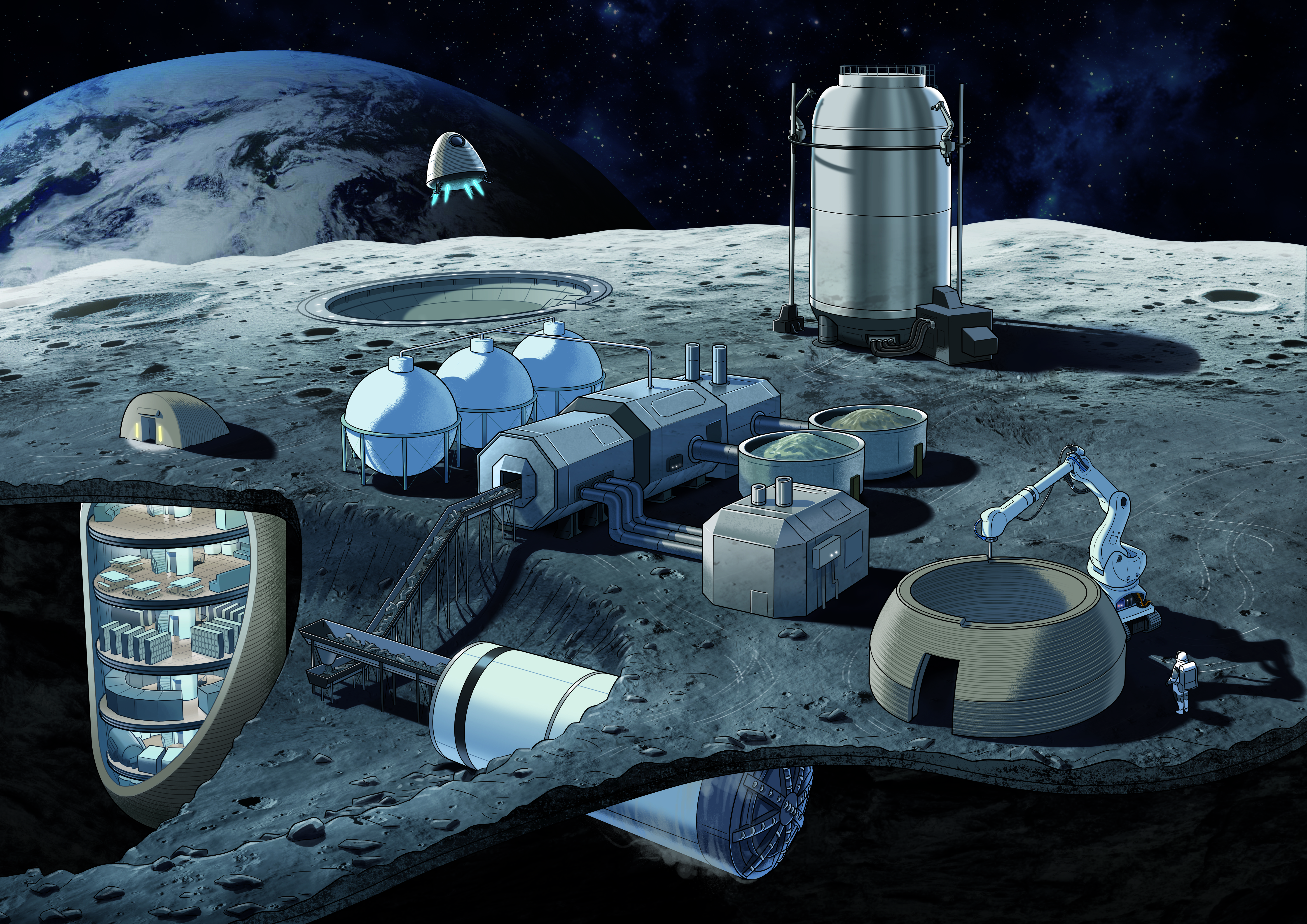 宇宙探査イノベーションハブの推進する「次世代コンセプト検討活動」にて検討したアセンブリ&マニュファクチャリングに関する月面探査イメージ