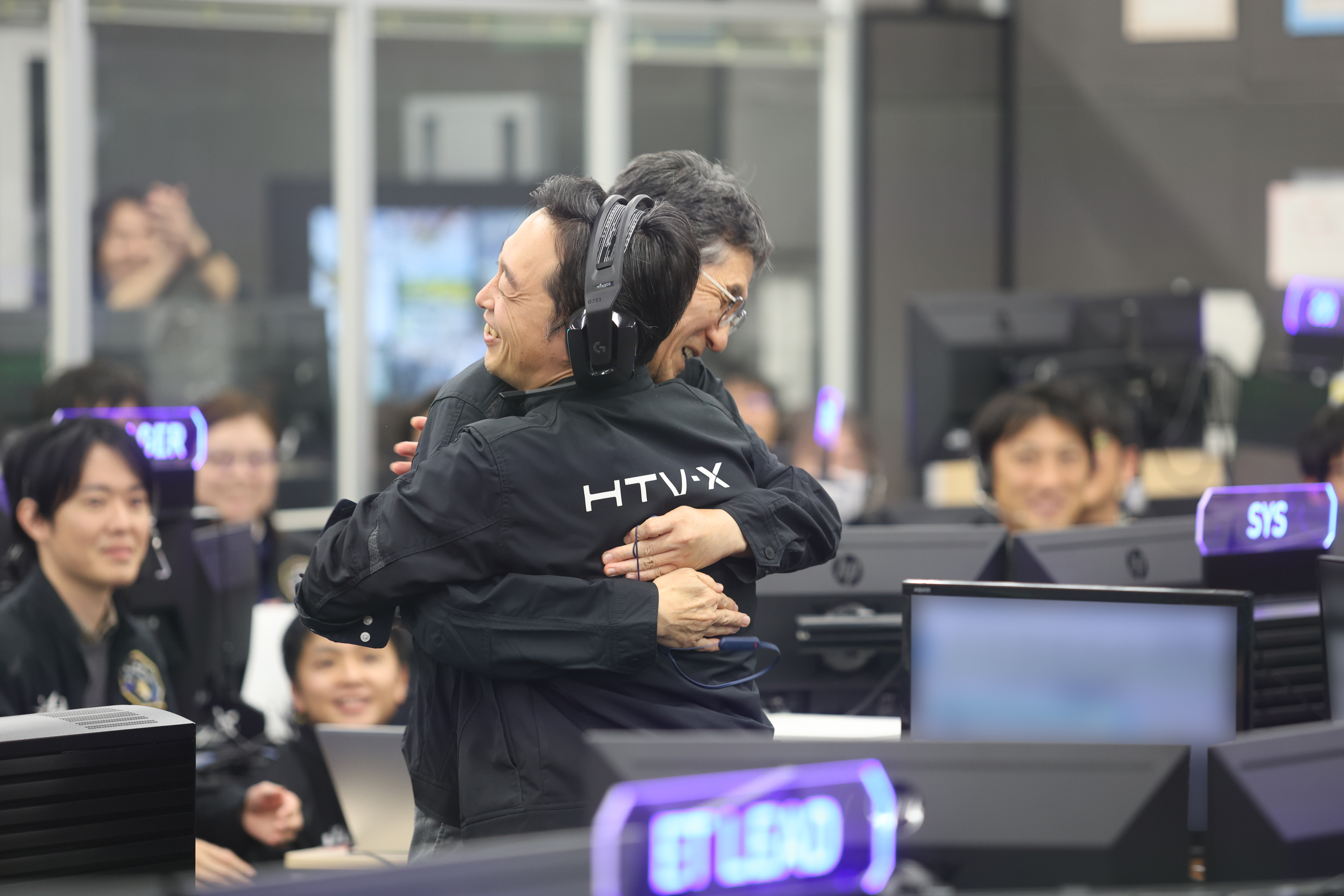 新型宇宙ステーション補給機(HTV-X)1号機の把持成功を喜ぶHTV-X運用管制室の様子 / 筑波宇宙センター(TKSC) 宇宙ステーション運用棟 HTV-X運用管制室 / 撮影日:2025年10月30日(日本時間)