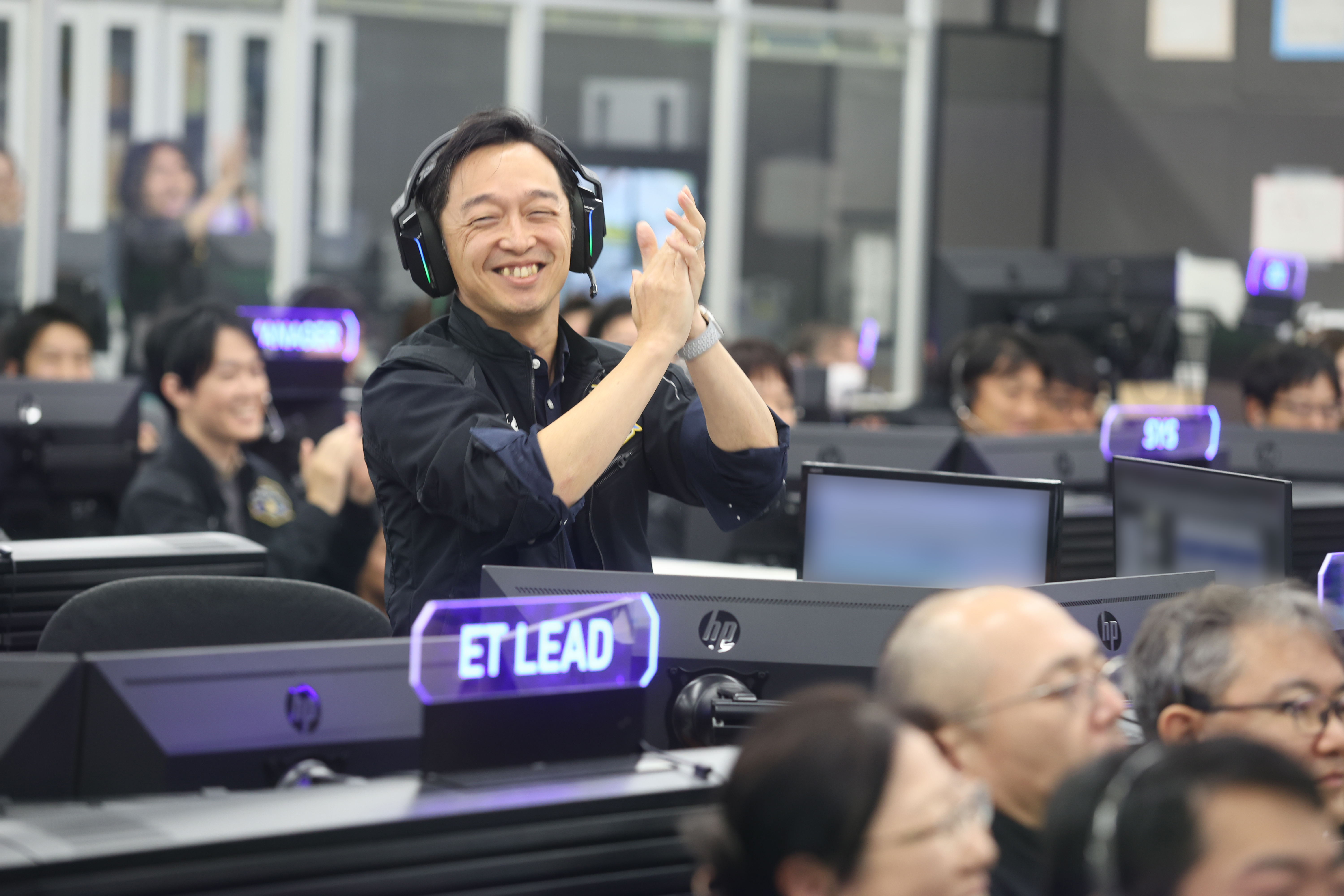 新型宇宙ステーション補給機(HTV-X)1号機の把持成功を喜ぶHTV-X運用管制室の様子 / 筑波宇宙センター(TKSC) 宇宙ステーション運用棟 HTV-X運用管制室 / 撮影日:2025年10月30日(日本時間)