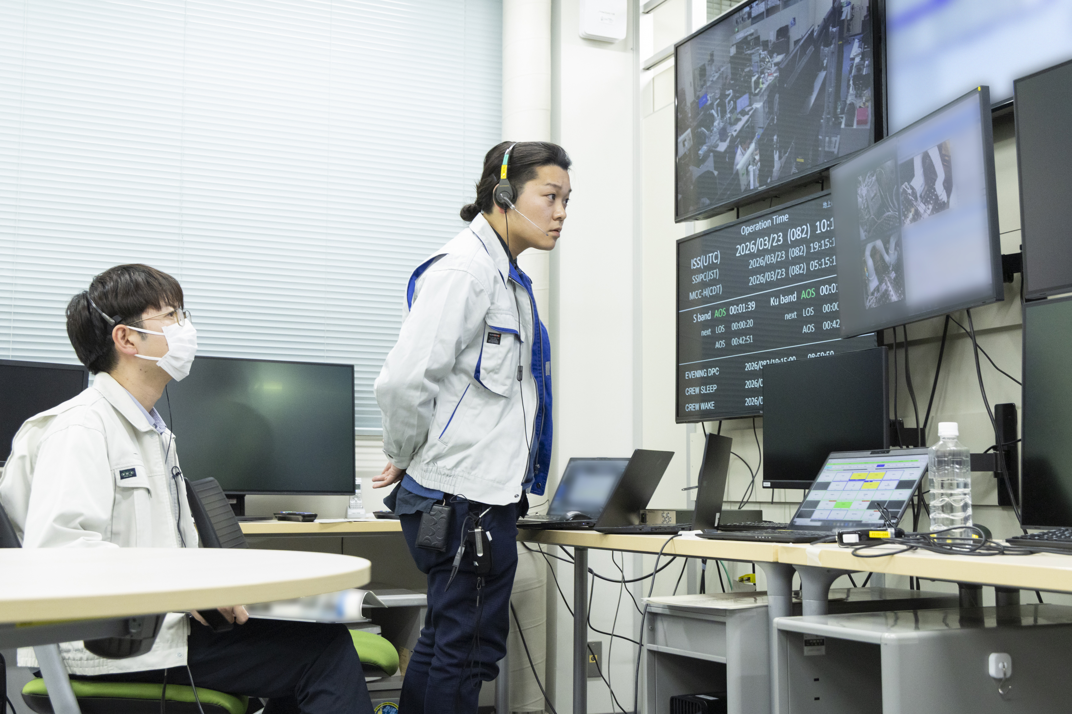 クリストファー・ウィリアムズ宇宙飛行士による、微小重力環境に起因する精密機器の誤差発生に関する影響解析(TUSK PM)のデモンストレーション(デモ#5)を見守る関係者 / 微小重力環境に起因する精密機器の誤差発生に関する影響解析(Test facility for lab-aUtomation System in Kibo Precision measurement Mission: TUSK PM) / 筑波宇宙センター(TKSC) 宇宙実験用棟 ユーザ運用エリア(UOA) / 撮影日:2026年3月23日(日本時間)