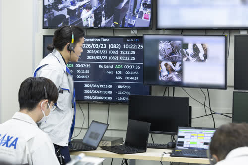 クリストファー・ウィリアムズ宇宙飛行士による、微小重力環境に起因する精密機器の誤差発生に関する影響解析(TUSK PM)のデモンストレーション(デモ#5)を見守る関係者 / 微小重力環境に起因する精密機器の誤差発生に関する影響解析(Test facility for lab-aUtomation System in Kibo Precision measurement Mission: TUSK PM) / 筑波宇宙センター(TKSC) 宇宙実験用棟 ユーザ運用エリア(UOA) / 撮影日:2026年3月23日(日本時間)