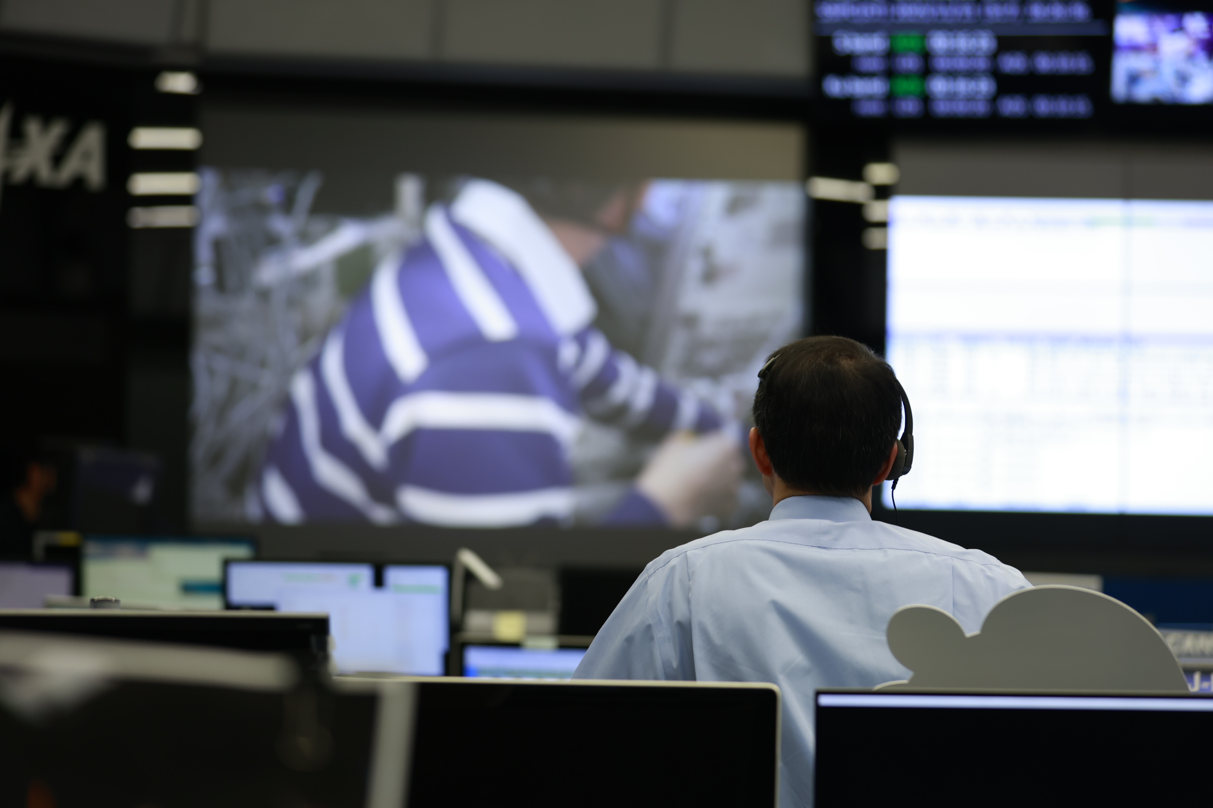 DRCSの流体実験ラックへの設置作業を見守る大西卓哉フライトディレクタ / 将来有人宇宙探査に向けた二酸化炭素除去の軌道上技術実証(JEM Demonstration of CO2 Removal System: DRCS) / 筑波宇宙センター(TKSC) 宇宙ステーション運用棟 「きぼう」運用管制室 / 撮影日:2025年11月13日(日本時間)