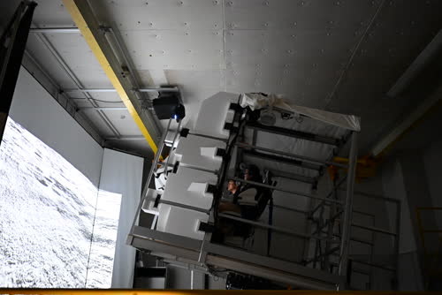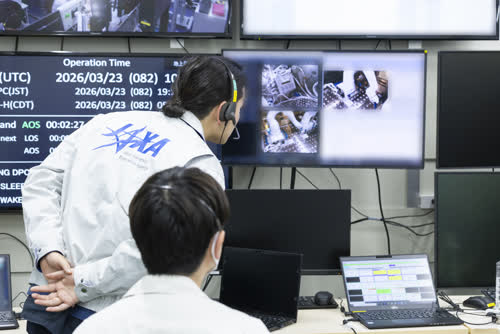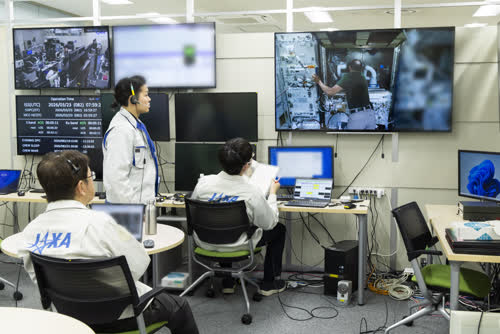 DRCSの流体実験ラックへの設置作業を見守る大西フライトディレクタ